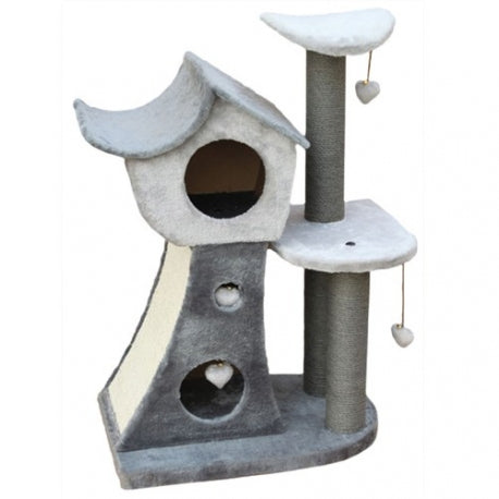 Votre chat prendra beaucoup de plaisir à jouer avec deux  jouets en fourrure et équipé de 2 plateaux plus une cache pour se reposer - le plus : un griffoir.